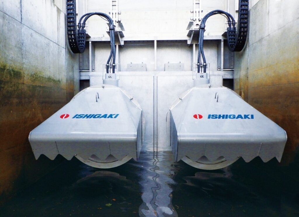 「フラッドバスター」は、全速全水位型横軸水中ポンプとして納入実績シェアNo.1を誇り、浸水被害から街や人を守っています。石垣は防災企業として、ポンプの力で浸水被害の防止に取り組んでいます。